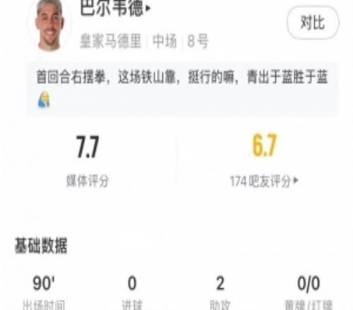 巴爾韋德全場數(shù)據(jù):2助攻4關(guān)鍵傳球+傳球成功率91%,獲評7.7分