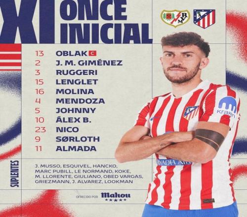 馬德里競(jìng)技首發(fā):13-奧布拉克、2-希門尼斯、3-魯杰里、15-朗格萊、16-莫利納、4-門多薩、5-卡多佐、10-巴埃納、23-尼古拉斯-岡薩雷斯、9-瑟洛特、11-阿爾馬達(dá)