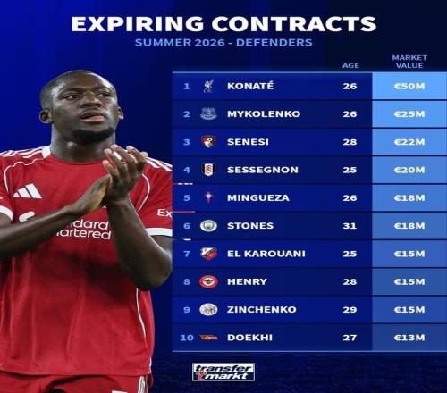 德國(guó)轉(zhuǎn)會(huì)市場(chǎng)統(tǒng)計(jì)了今夏合同到期的十大后衛(wèi),其中球員按照身價(jià)從高到低排序。