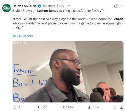 賽后杰倫-布朗回應(yīng)詹姆斯說自己應(yīng)該進(jìn)入MVP討論的話題,布朗說道:聽到詹姆斯說我應(yīng)該進(jìn)入MVP討論這是一種榮耀,勒布朗可以說是NBA歷史最出色的球員,這是很高的贊美,我每天醒來都會心存感激。